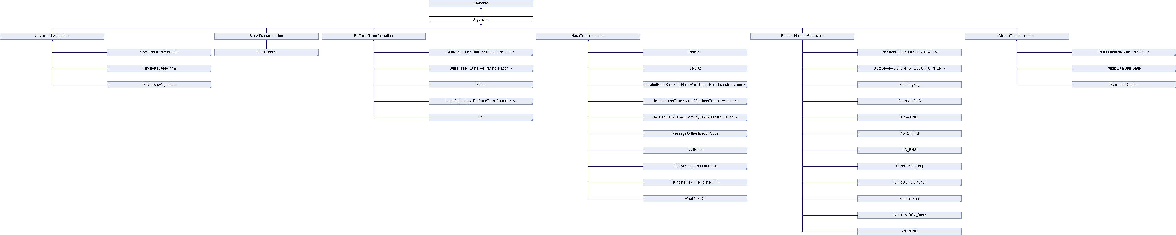Clonable AsymmetricAlgorithm BlockTransformation BufferedTransformation HashTransformation RandomNumberGenerator StreamTransformation KeyAgreementAlgorithm PrivateKeyAlgorithm PublicKeyAlgorithm BlockCipher AutoSignaling< BufferedTransformation > Bufferless< BufferedTransformation > Filter InputRejecting< BufferedTransformation > Sink Adler32 CRC32 IteratedHashBase< T_HashWordType, HashTransformation > IteratedHashBase< word32, HashTransformation > IteratedHashBase< word64, HashTransformation > MessageAuthenticationCode NullHash PK_MessageAccumulator TruncatedHashTemplate< T > Weak1::MD2 AdditiveCipherTemplate< BASE > AutoSeededX917RNG< BLOCK_CIPHER > BlockingRng ClassNullRNG FixedRNG KDF2_RNG LC_RNG NonblockingRng PublicBlumBlumShub RandomPool Weak1::ARC4_Base X917RNG AuthenticatedSymmetricCipher PublicBlumBlumShub SymmetricCipher