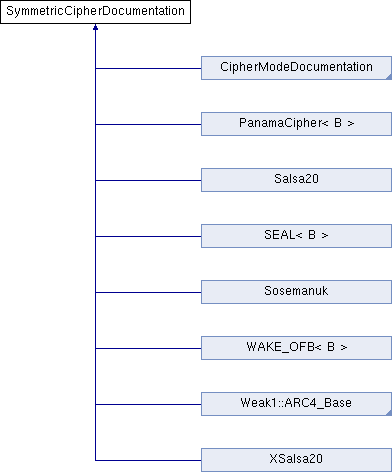 Each class derived from this one defines two types, Encryption and Decryption, both of which implement the SymmetricCipher interface. Two types of classes derive from this class: stream ciphers and block cipher modes. Stream ciphers can be used alone, cipher mode classes need to be used with a block cipher. See CipherModeDocumentation for more for information about using cipher modes and block ciphers.