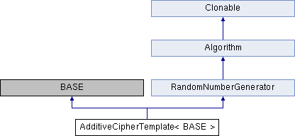 Inheritance diagram for AdditiveCipherTemplate< BASE >:Public Types | |