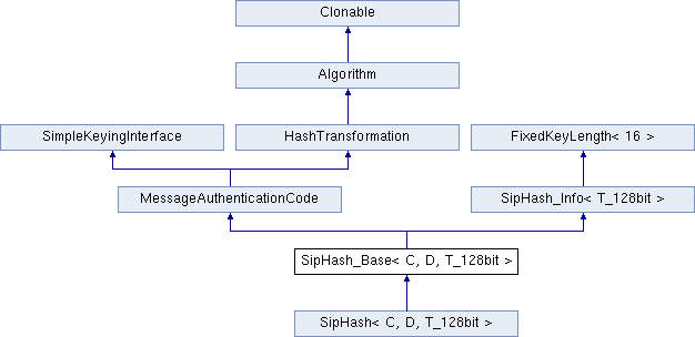 Inheritance diagram for SipHash_Base< C, D, T_128bit >:Public Member Functions | |