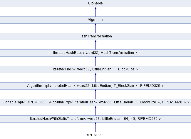 Public Member Functions inherited from IteratedHashWithStaticTransform< word32, LittleEndian, 64, 40, RIPEMD320 > | |