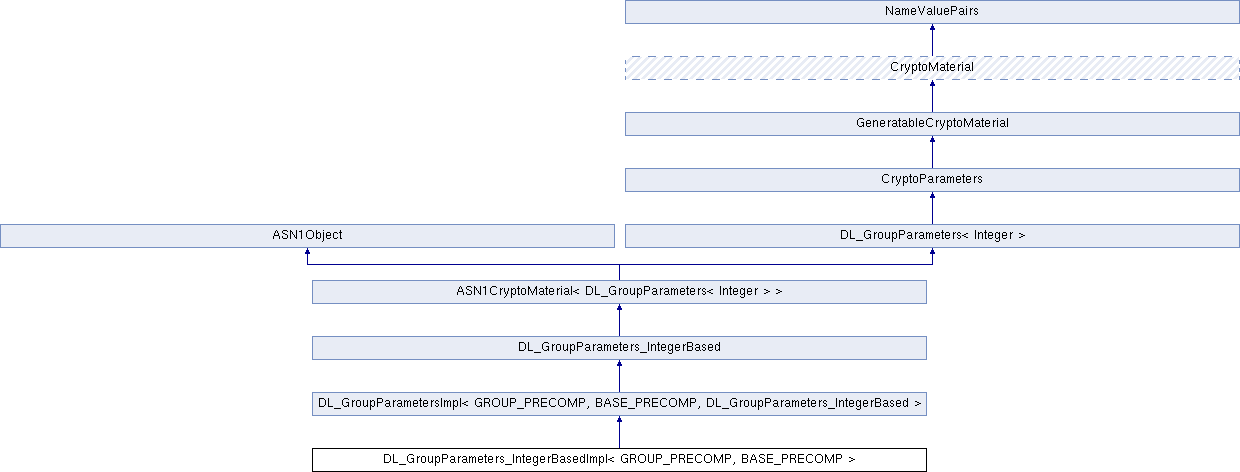Inheritance diagram for DL_GroupParameters_IntegerBasedImpl< GROUP_PRECOMP, BASE_PRECOMP >:Public Types | |