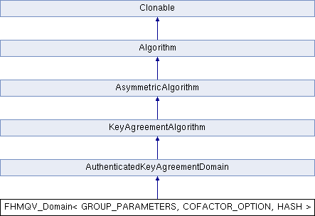 Inheritance diagram for FHMQV_Domain< GROUP_PARAMETERS, COFACTOR_OPTION, HASH >:Public Types | |