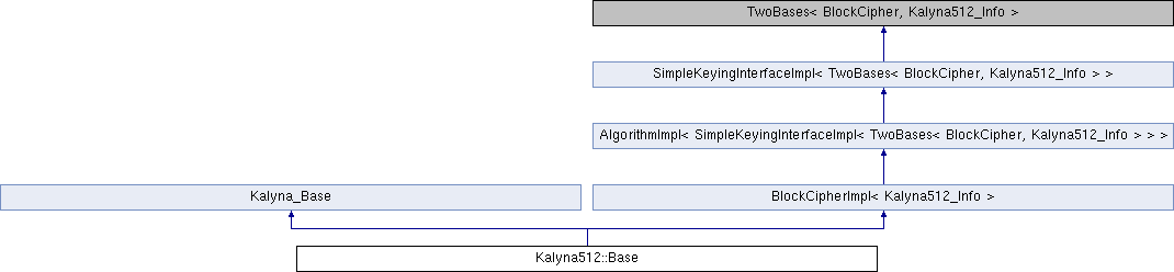 - Public Member Functions inherited from SimpleKeyingInterfaceImpl< TwoBases< BlockCipher, Kalyna512_Info > >