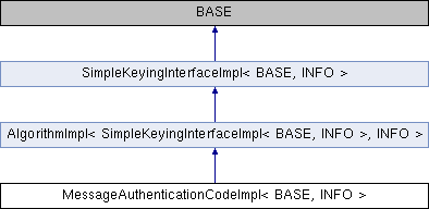 Inheritance diagram for MessageAuthenticationCodeImpl< BASE, INFO >:Additional Inherited Members | |