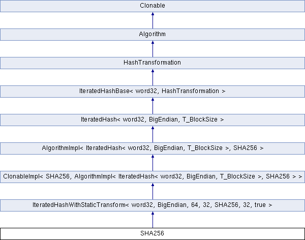 - Public Member Functions inherited from IteratedHashWithStaticTransform< word32, BigEndian, 64, 32, SHA256, 32, true >