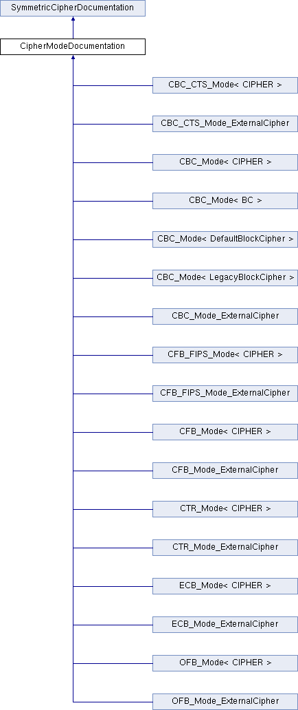 Each class derived from this one defines two types, Encryption and Decryption, both of which implement the SymmetricCipher interface. For each mode there are two classes, one of which is a template class, and the other one has a name that ends in "_ExternalCipher". The "external cipher" mode objects hold a reference to the underlying block cipher, instead of holding an instance of it. The reference must be passed in to the constructor. For the "cipher holder" classes, the CIPHER template parameter should be a class derived from BlockCipherDocumentation, for example DES or AES.