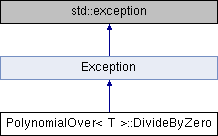 Inheritance diagram for PolynomialOver< T >::DivideByZero:Additional Inherited Members | |