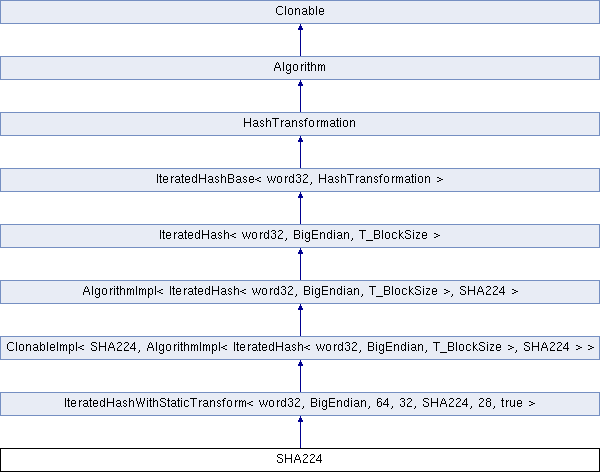 Public Member Functions inherited from ClonableImpl< SHA224, AlgorithmImpl< IteratedHash< word32, BigEndian, T_BlockSize >, SHA224 > > | |