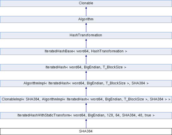Public Member Functions inherited from ClonableImpl< SHA384, AlgorithmImpl< IteratedHash< word64, BigEndian, T_BlockSize >, SHA384 > > | |