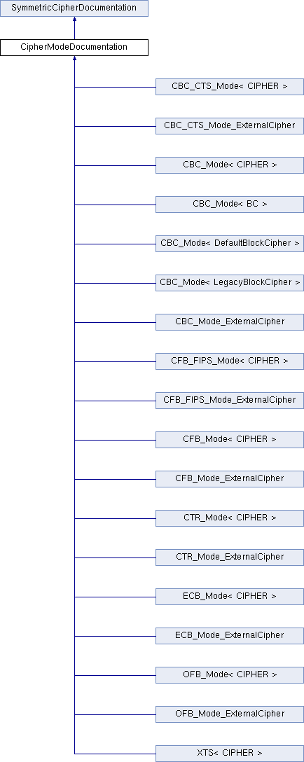 Each class derived from this one defines two types, Encryption and Decryption, both of which implement the SymmetricCipher interface. For each mode there are two classes, one of which is a template class, and the other one has a name that ends in "_ExternalCipher". The "external cipher" mode objects hold a reference to the underlying block cipher, instead of holding an instance of it. The reference must be passed in to the constructor. For the "cipher holder" classes, the CIPHER template parameter should be a class derived from BlockCipherDocumentation, for example DES or AES.
