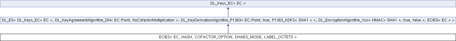 Inheritance diagram for ECIES< EC, HASH, COFACTOR_OPTION, DHAES_MODE, LABEL_OCTETS >:Static Public Member Functions | |