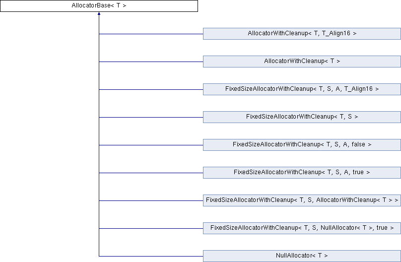 Inheritance diagram for AllocatorBase< T >:Public Types | |