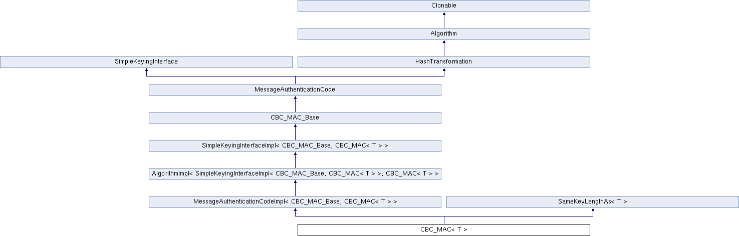 Inheritance diagram for CBC_MAC< T >:Public Member Functions | |