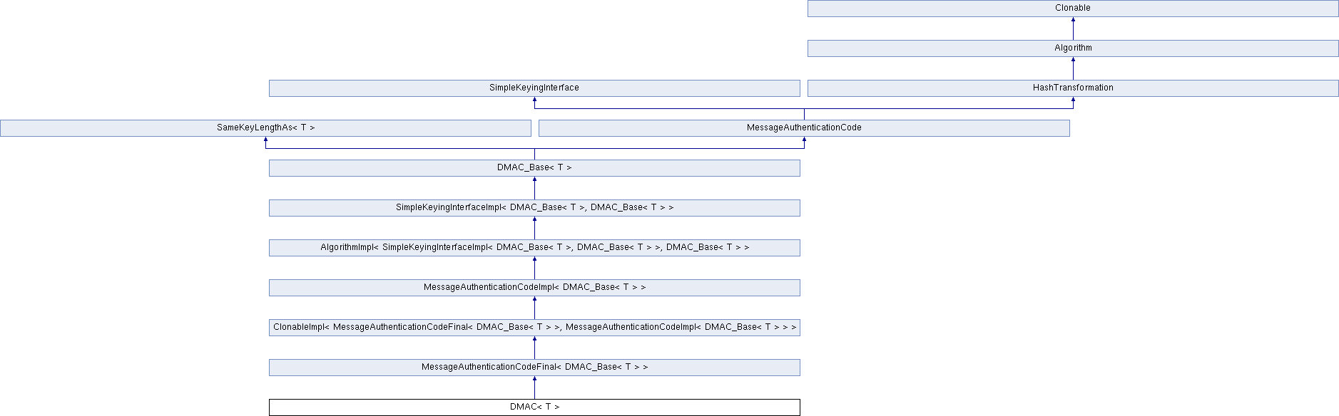 Public Member Functions inherited from ClonableImpl< MessageAuthenticationCodeFinal< DMAC_Base< T > >, MessageAuthenticationCodeImpl< DMAC_Base< T > > > | |