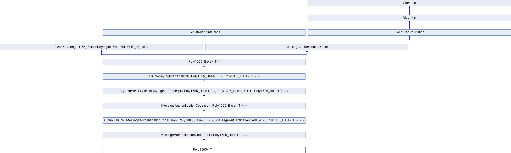 Inheritance diagram for Poly1305< T >:Public Member Functions | |