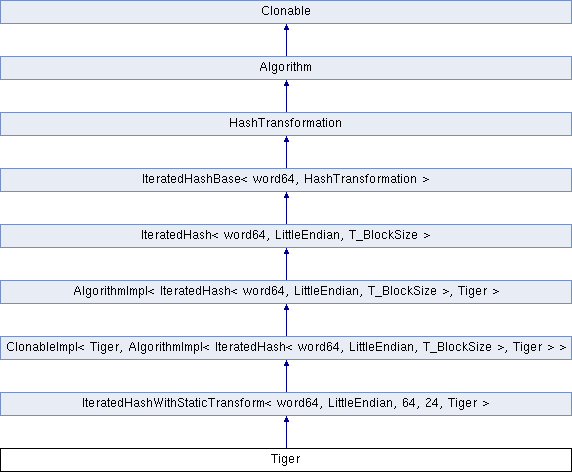 Public Member Functions inherited from ClonableImpl< Tiger, AlgorithmImpl< IteratedHash< word64, LittleEndian, T_BlockSize >, Tiger > > | |