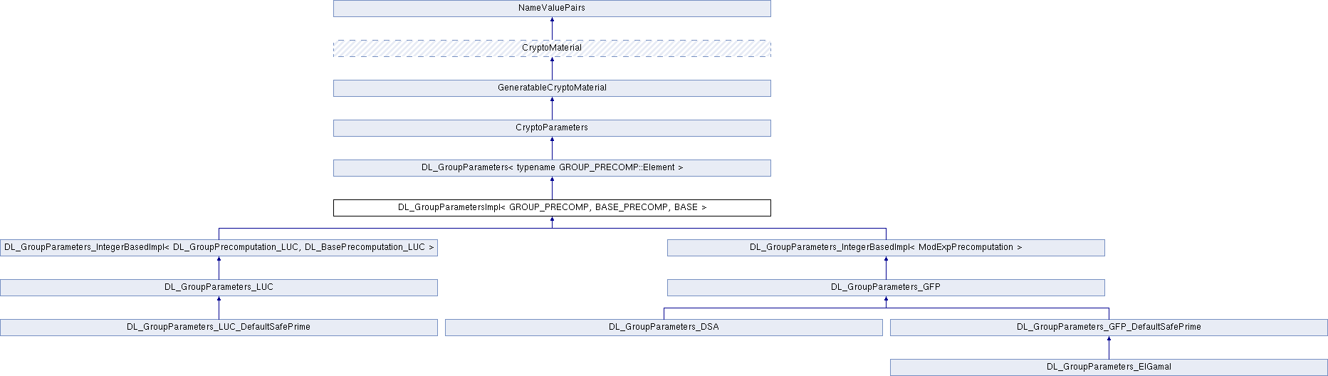 Inheritance diagram for DL_GroupParametersImpl< GROUP_PRECOMP, BASE_PRECOMP, BASE >:Public Types | |