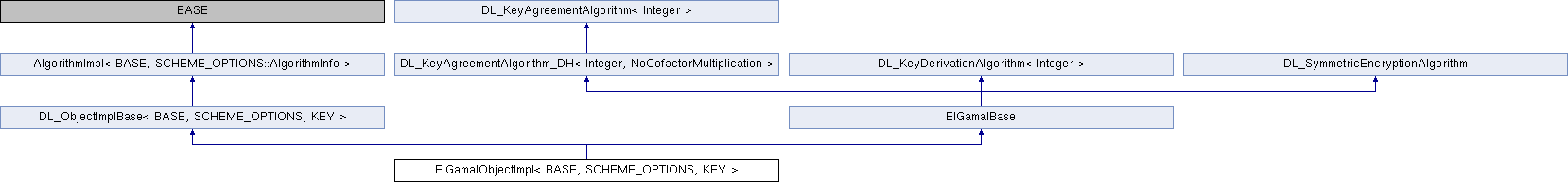 Inheritance diagram for ElGamalObjectImpl< BASE, SCHEME_OPTIONS, KEY >:Public Member Functions | |