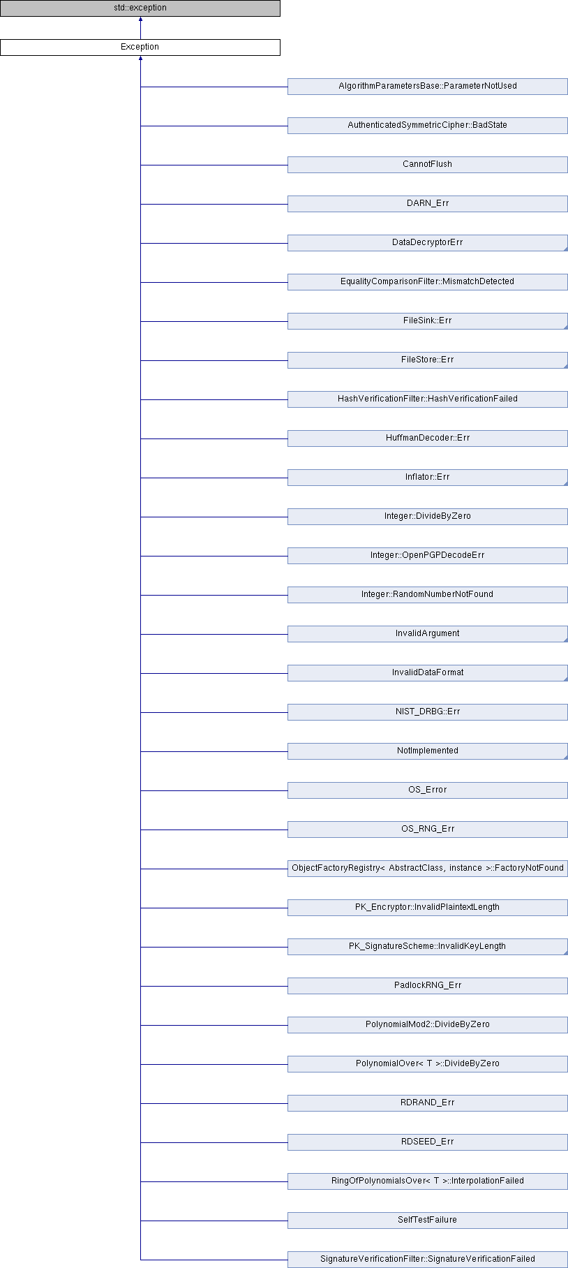 All library exceptions directly or indirectly inherit from the Exception class. The Exception class itself inherits from std::exception. The library does not use std::runtime_error derived classes.