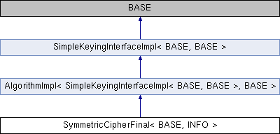 Inheritance diagram for SymmetricCipherFinal< BASE, INFO >:Public Member Functions | |