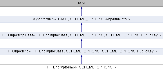 Inheritance diagram for TF_EncryptorImpl< SCHEME_OPTIONS >:Additional Inherited Members | |