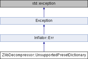Inheritance diagram for ZlibDecompressor::UnsupportedPresetDictionary:Additional Inherited Members | |