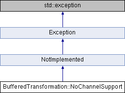 Inheritance diagram for BufferedTransformation::NoChannelSupport:Public Member Functions | |