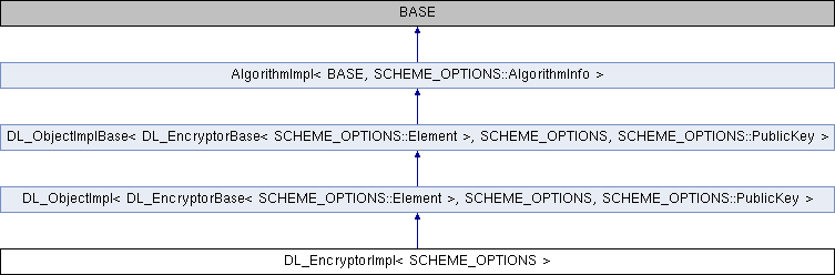 Inheritance diagram for DL_EncryptorImpl< SCHEME_OPTIONS >:Additional Inherited Members | |