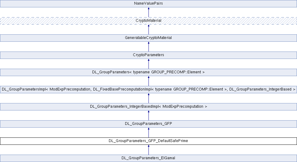 Inheritance diagram for DL_GroupParameters_GFP_DefaultSafePrime:Public Types | |