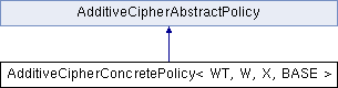 Inheritance diagram for AdditiveCipherConcretePolicy< WT, W, X, BASE >:Public Types | |