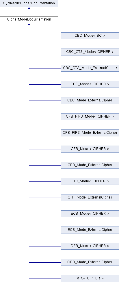 Each class derived from this one defines two types, Encryption and Decryption, both of which implement the SymmetricCipher interface. For each mode there are two classes, one of which is a template class, and the other one has a name that ends in "_ExternalCipher". The "external cipher" mode objects hold a reference to the underlying block cipher, instead of holding an instance of it. The reference must be passed in to the constructor. For the "cipher holder" classes, the CIPHER template parameter should be a class derived from BlockCipherDocumentation, for example DES or AES.