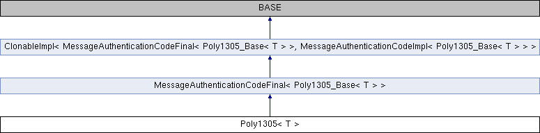 Inheritance diagram for Poly1305< T >:Public Member Functions | |