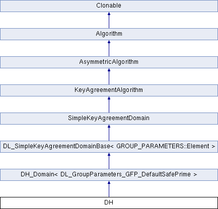 DH() class is a typedef of DH_Domain(). The documentation that follows does not exist. Rather the documentation was created in response to Issue 328, Diffie-Hellman example code not compiling.