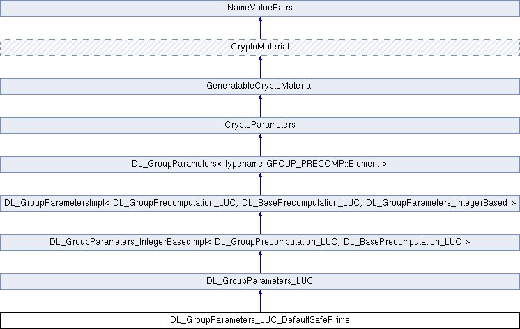 Inheritance diagram for DL_GroupParameters_LUC_DefaultSafePrime:Public Types | |