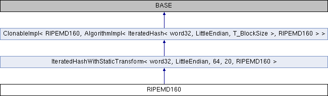 Public Member Functions inherited from IteratedHashWithStaticTransform< word32, LittleEndian, 64, 20, RIPEMD160 > | |