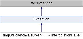 Inheritance diagram for RingOfPolynomialsOver< T >::InterpolationFailed:Additional Inherited Members | |