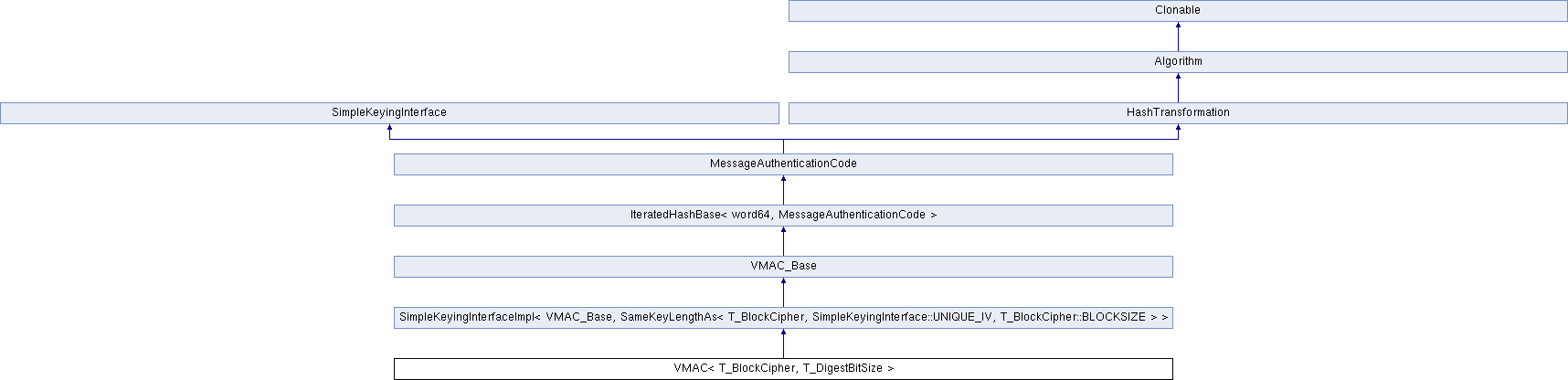 Inheritance diagram for VMAC< T_BlockCipher, T_DigestBitSize >:Static Public Member Functions | |