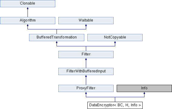 Inheritance diagram for DataEncryptor< BC, H, Info >:Public Member Functions | |