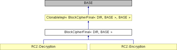 Inheritance diagram for BlockCipherFinal< DIR, BASE >: