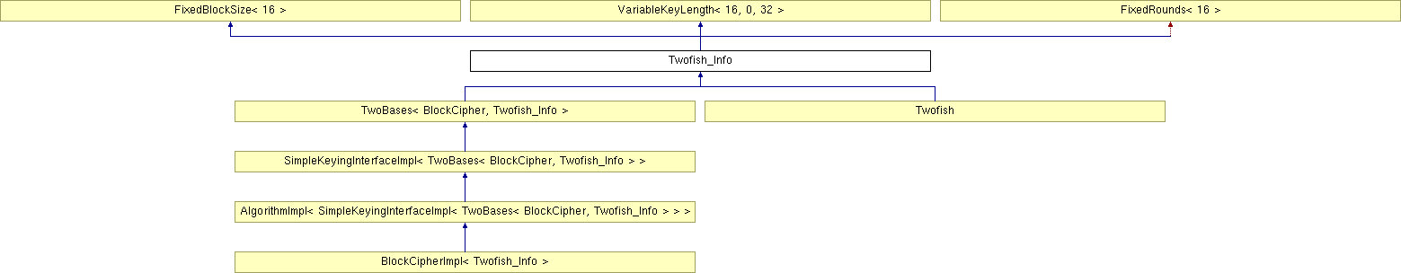 FixedBlockSize< 16 > VariableKeyLength< 16, 0, 32 > FixedRounds< 16 > TwoBases< BlockCipher, Twofish_Info > Twofish SimpleKeyingInterfaceImpl< TwoBases< BlockCipher, Twofish_Info > > AlgorithmImpl< SimpleKeyingInterfaceImpl< TwoBases< BlockCipher, Twofish_Info > > > BlockCipherImpl< Twofish_Info > List of all members.