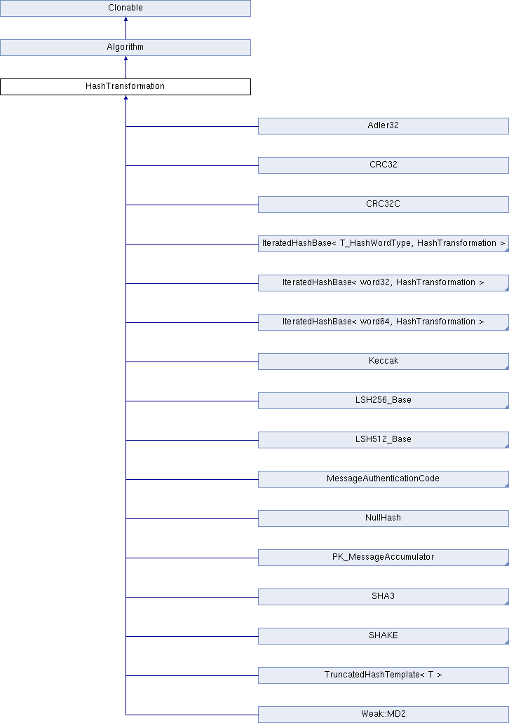 Implemented in PK_MessageAccumulator, BLAKE2b, BLAKE2s, XChaCha20Poly1305_Base, IteratedHashWithStaticTransform< T_HashWordType, T_Endianness, T_BlockSize, T_StateSize, T_Transform, T_DigestSize, T_StateAligned >, Poly1305TLS_Base, LSH512_Base, Poly1305_Base< T >, ChaCha20Poly1305_Base, SipHash_Base< C, D, T_128bit >, CRC32C, GCM_Base, Keccak, Weak::PanamaHash< B >, CCM_Base, TruncatedHashTemplate< T >, EAX_Base, LSH256_Base, SHAKE, SHA3, CMAC_Base, VMAC_Base, CRC32, HMAC_Base, DMAC_Base< T >, Weak::MD2, CBC_MAC_Base, TTMAC_Base, Adler32, and NullHash.